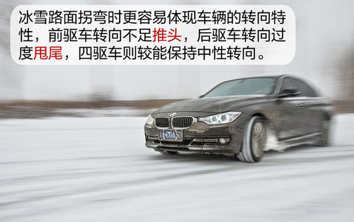 车辆在冰雪路面拐弯更容易体现车辆的转向特性,前驱车易转向不足推头,后驱车则容易转向过度发生甩尾,然而四驱车型则表现较稳定,不易发生推头或甩尾。所以,在车辆拐弯时更需小心翼翼。