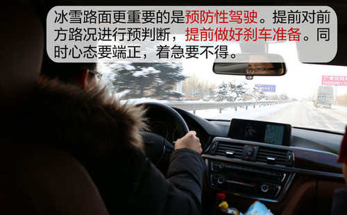 拥有良好的驾驶意识后,冰雪路面上行驶并不难驾驭。冰雪路面是一面放大镜,将平常驾驶陋习逐一放大。因此保持良好的驾驶意识,提前对前方路段进行预判,早点做好刹车准备。这样可大大提高冰雪路面的驾驶安全性。还有更重要一点是,心态需放平稳。