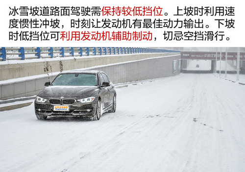 冰雪路面情况下行驶在坡道上较为危险。上坡时更应当利用车辆的惯性冲坡,避免在坡中停车,以免打滑起步困难,特别是后驱车型。。下坡时可多利用低挡位用发动机辅助制动,让车速减慢。